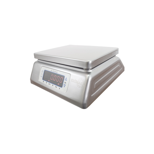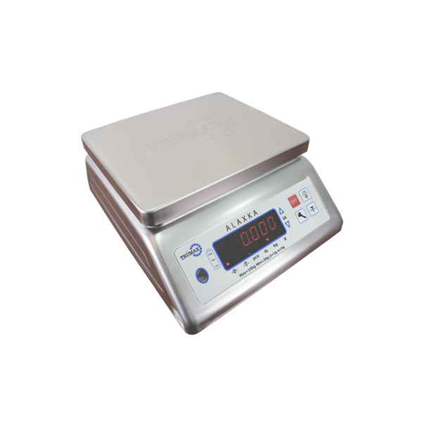 Balanza de mesa Trumax Alaxka fabricada en acero inoxidable con proteccion IP67 especial para ambientes húmedos y manejo de alimentos, doble display tipo LED rojo de alta visibilidad, plato en acero inoxidable de 23×19 cm, bateria recargable con conexión de 110 voltios. Cuenta con alarma de pesaje y ahorro de energia. Capacidad máxima disponible: 3kg x 0,2g; 7,5kg x 0,5g; 15kg x 1g; 30kg x 2g.