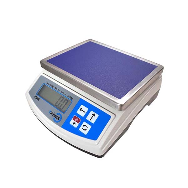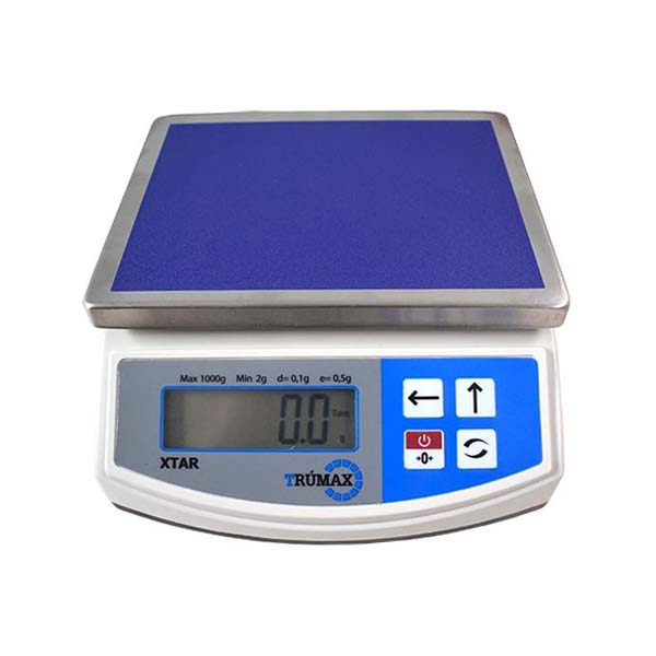 Balanza de mesa Trumax Xtar alimentada por pilas AA, fabricada en ABS de alta resistencia, display LCD, plato en acero inoxidable de 18,5 x 14 cm. Cuenta con 3 unidades de peso, límites de peso, auto apagado. Capacidades disponibles 1000g x 0.1g y 3000g x 0.5g.